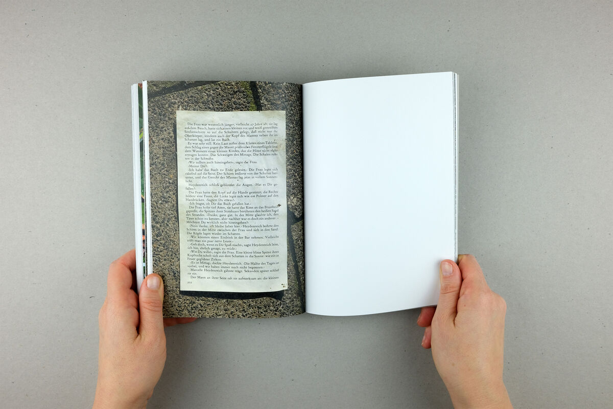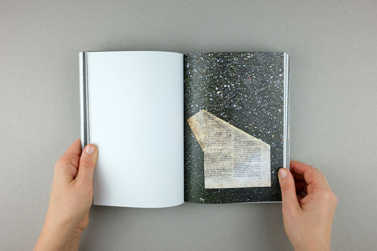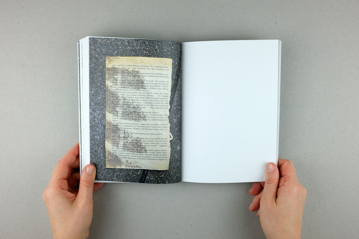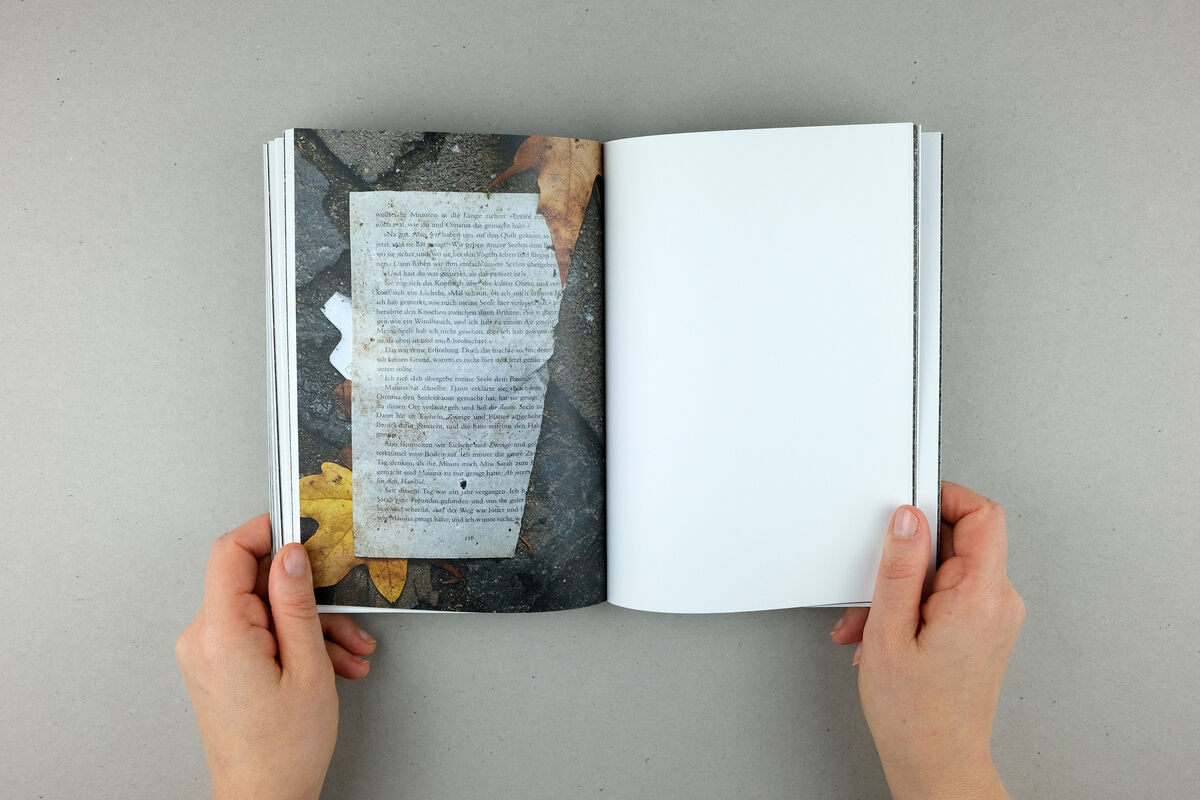 A book consisting of chance finds. Lost book pages (collected over many years), photographed at the respective found spot and reclassified based on the original pagination in the otherwise blank book. The title of the book originates from a selected text passage.
