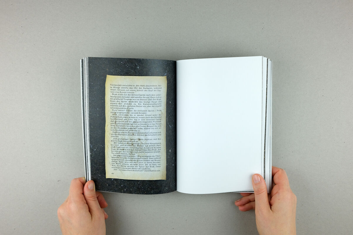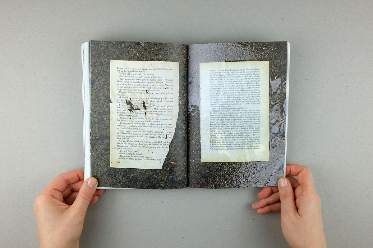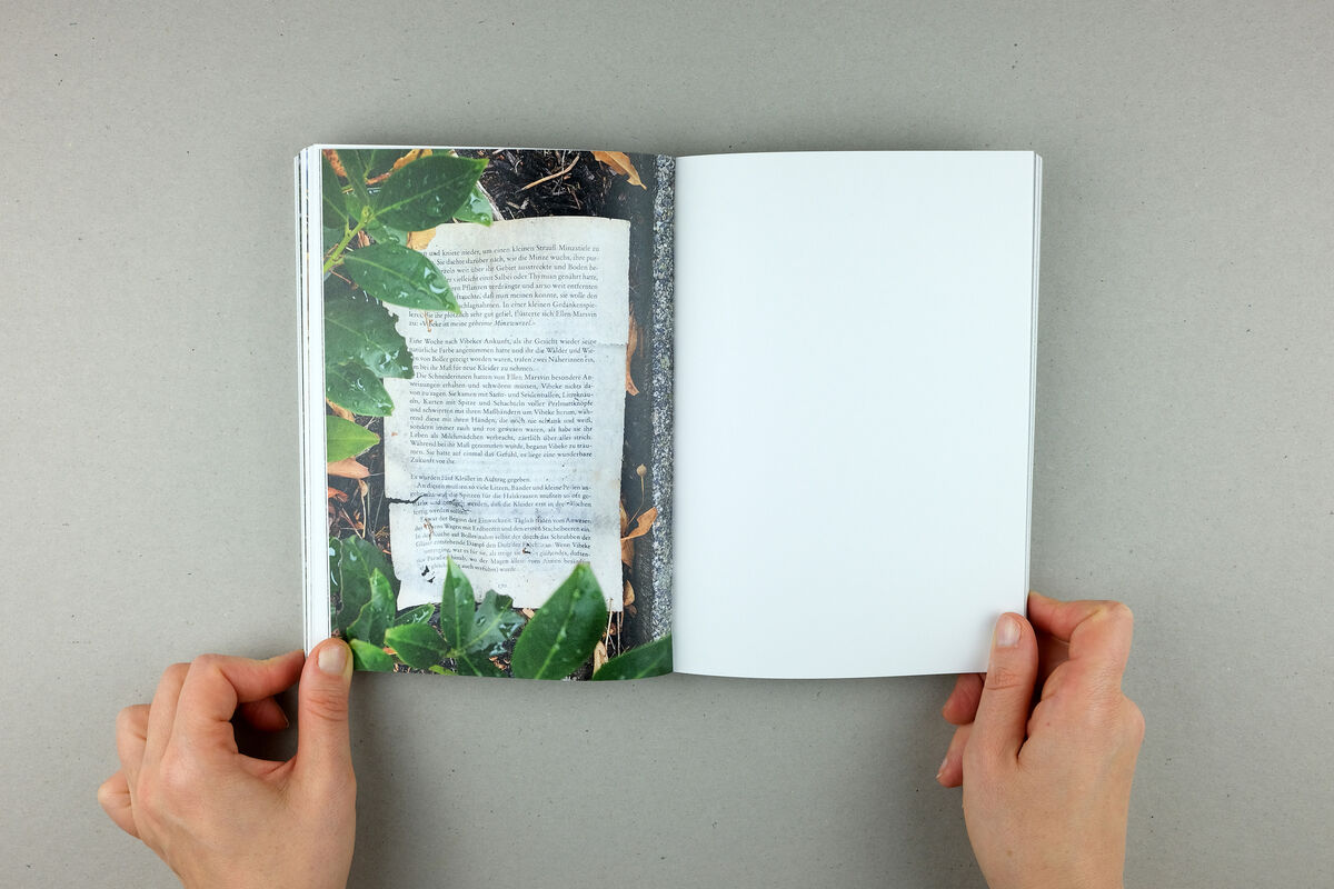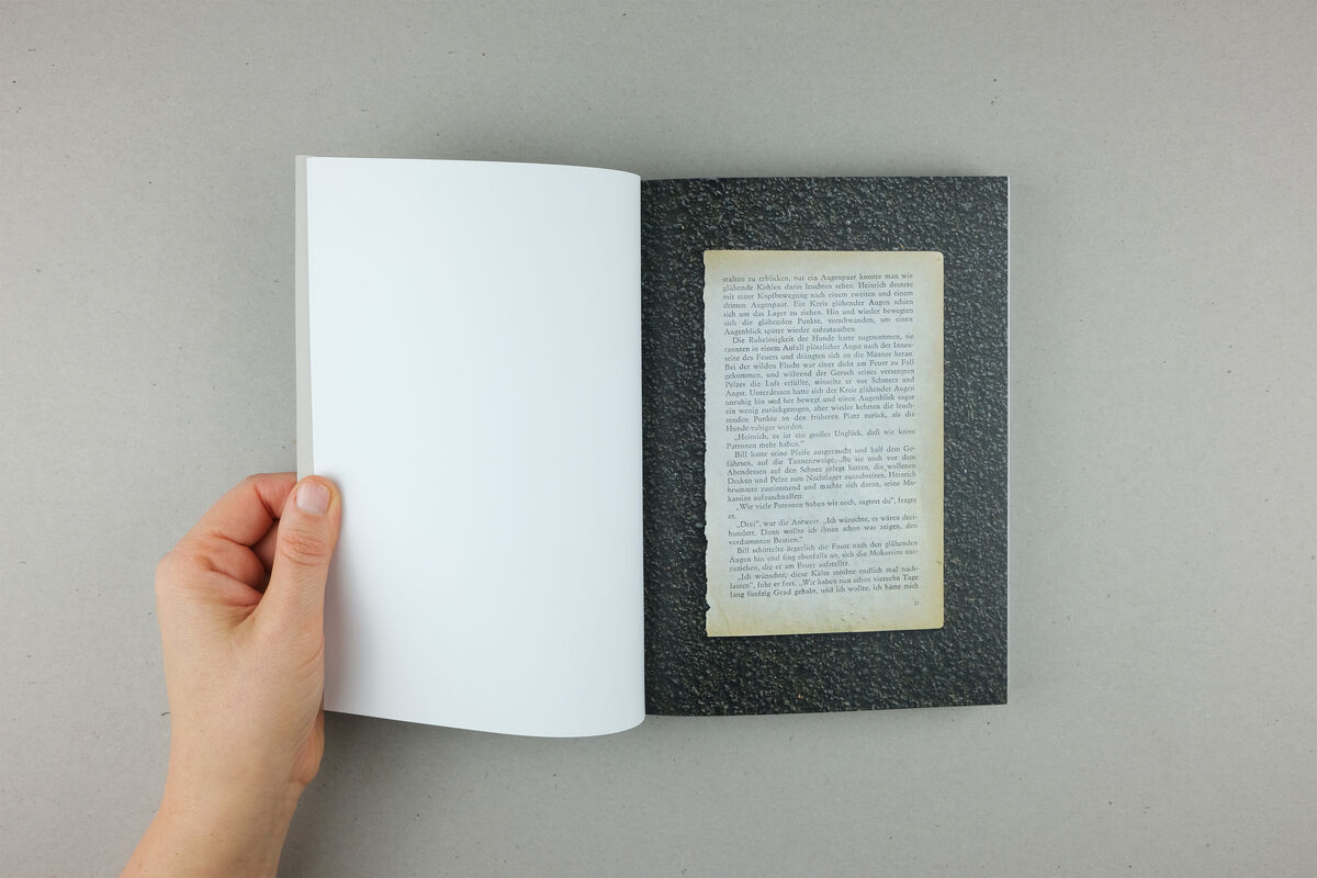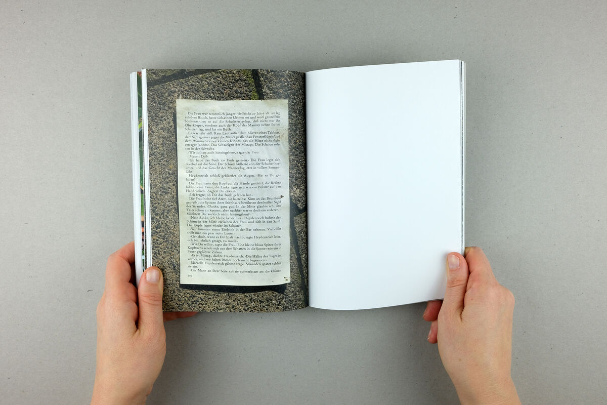 A book consisting of chance finds. Lost book pages (collected over many years), photographed at the respective found spot and reclassified based on the original pagination in the otherwise blank book. The title of the book originates from a selected text passage.